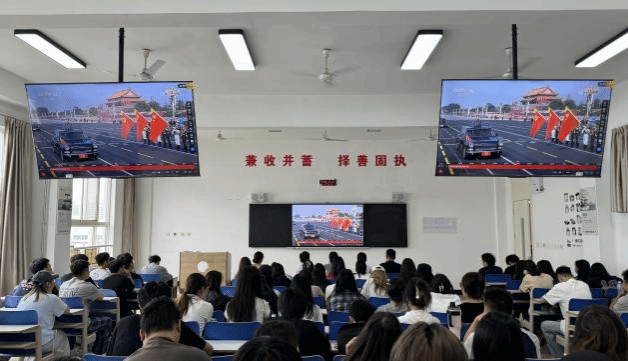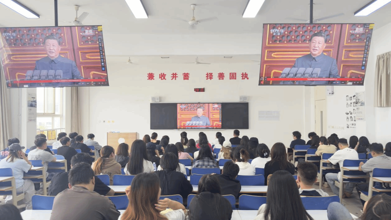 盛世华章,教育担当!2025年9月3日,纪念中国人民抗日战争暨世界反法西斯战争胜利80周年阅兵活动隆重举行。服装学院组织学生代表收看直播。服装学院党委副书记、学工办主任王军宝,及全体辅导员同观看了此次阅兵直播,大家心潮澎湃,展开热议。