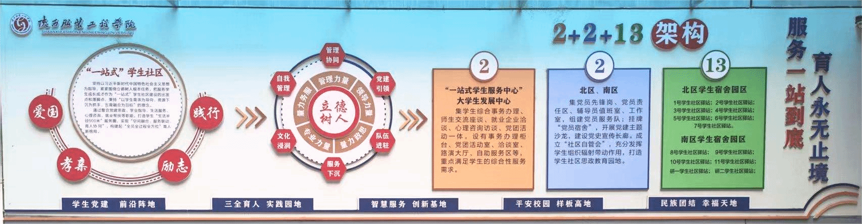自开展“一站式”学生社区建设试点工作以来,学校深入学习贯彻习近平总书记关于教育的重要论述,全面落实立德树人根本任务,构建了“12345”工作布局:“筑牢一个核心(党建引领)、畅通两条路径(线下办事大厅、线上学工系统平台)、深化三全育人(全员、全过程、全方位)、集聚四种力量(领导力量、管理力量、服务力量、思政力量)、实现五育并举(德智体美劳)”,统筹调动各类教育教学主体、要素、环节和资源服务保障学生成长发展需求。学校逐步形成“1+2+13”的空间格局,即一个主体、两中心支撑、十三个驿站协同发力。