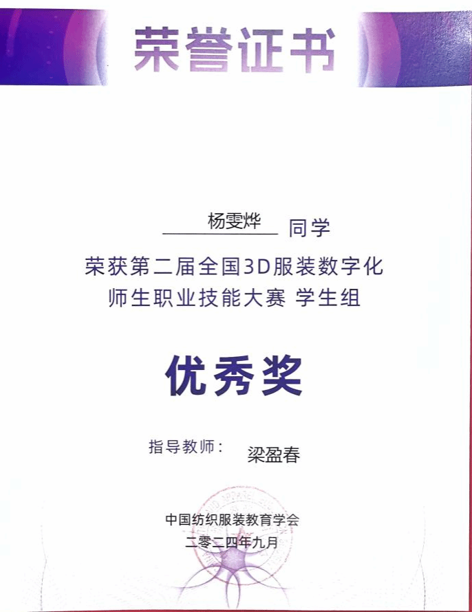 在各类竞赛中,她荣获国家级奖项2项、省级2项、市级3项、校级11项,并持有服装3D建模师、服装制版师、社会体育指导证等多项专业资格证书。这些荣誉不仅是对她个人能力的肯定,更是她不断探索、勇于创新的见证。