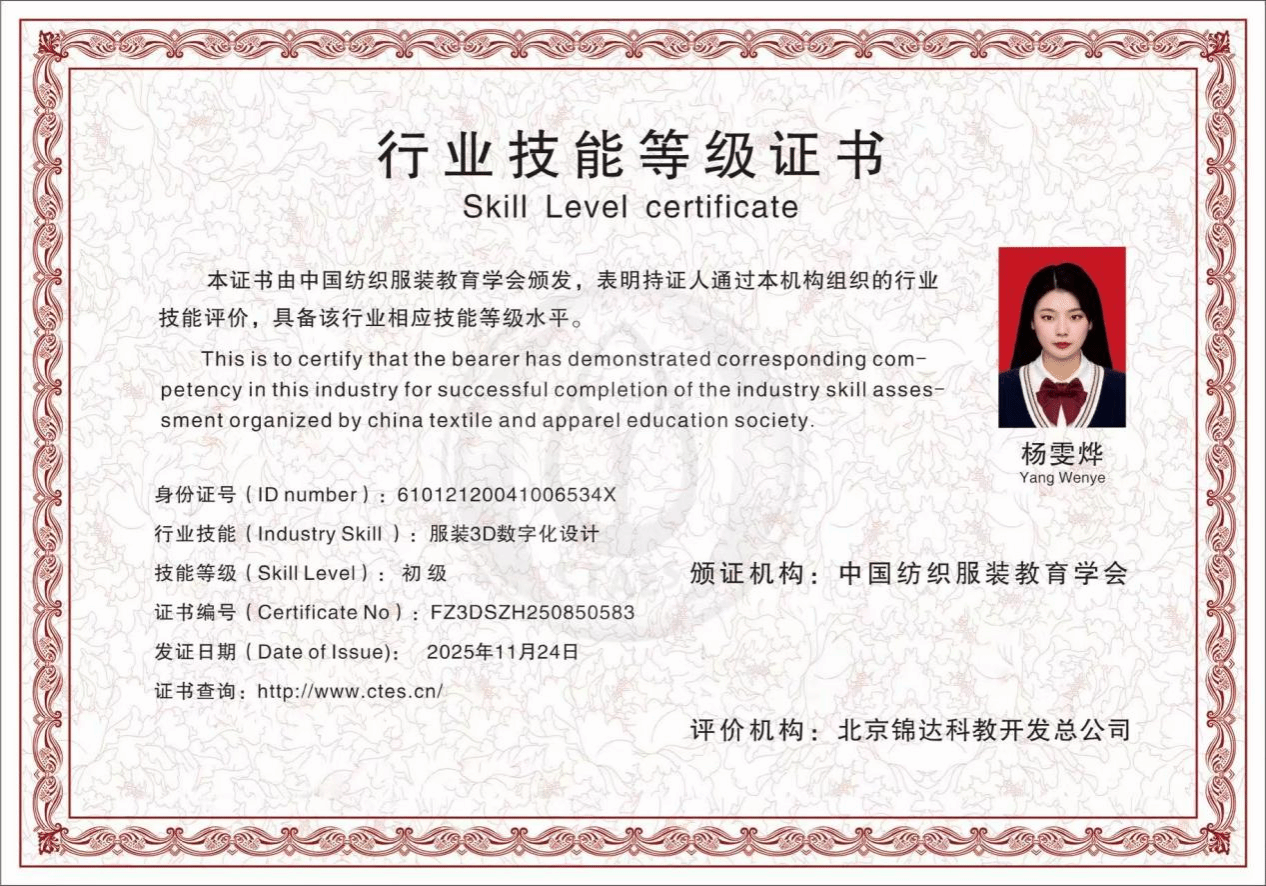 同时,杨雯烨担任服装学院22级教学信息员组长和3D建模社团副部长,协调学院教学反馈与社团活动,有效推动了专业实践与理论教学的紧密结合。