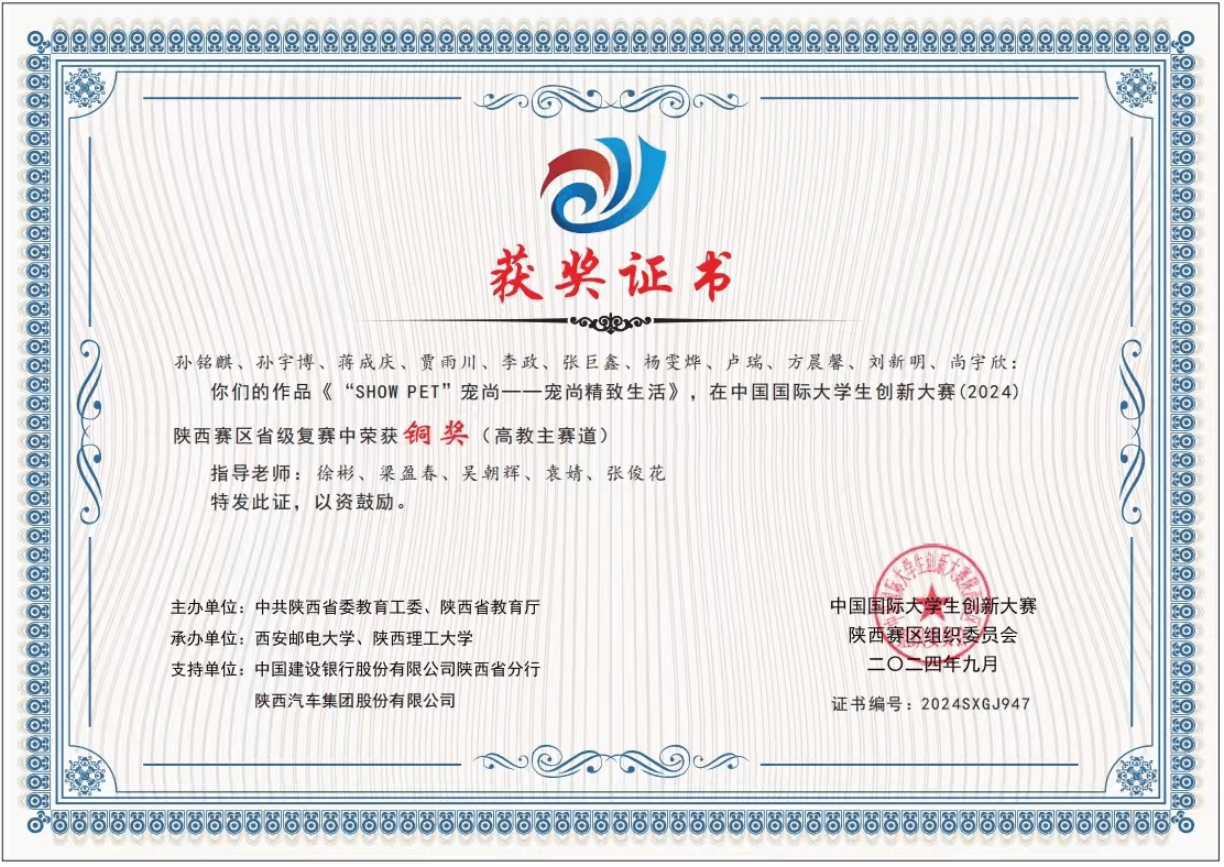 主要荣誉:“国家励志奖学金”、“服装3D数字化职业技能大赛全国优秀奖”、中国国际大学生创新大赛(2024)陕西赛区省级复赛铜奖、中国国际大学生创新大赛(2025)陕西赛区省级铜奖、“优秀学生干部”、“优秀学生”、“优秀学习标兵”、“‘陕服杯’乒乓球锦标赛女子双打第一名”、社会实践优秀学生等。