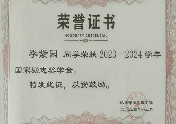 主要荣誉:2024——2025学年国家奖学金、2024——2025学年“优秀学生标兵”、“优秀共青团员”、2023——2024学年国家励志奖学金、2023——2024学年“优秀学生”、“社会实践先进个人”等。