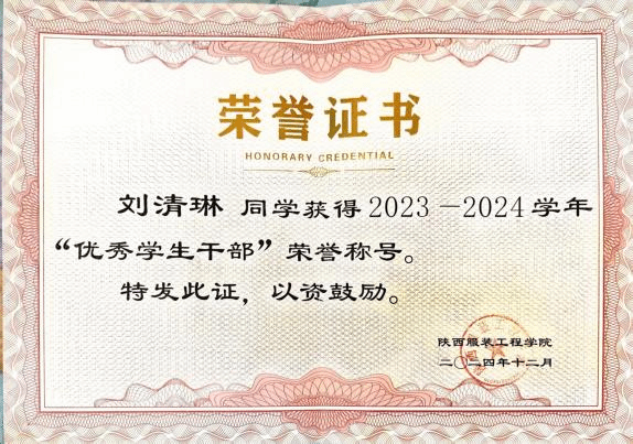 主要荣誉:国家励志奖学金、“优秀学生干部”、优秀共青团员、中国国际大学生创新创业大赛优秀奖,“中外传播杯”大学生英语翻译大赛二等奖,“展团干风采,筑教育荣光”团干部素质能力大赛二等奖等。