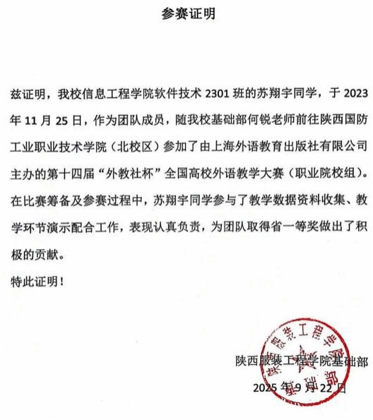 凭借这份执着与坚持,他的学业成绩始终名列前茅,多次斩获校级及以上奖学金。在专业实践中,他注重理论与实际结合,将所学知识运用到实践创新中,先后在英语学科竞赛中荣获省级一等奖等多项荣誉,在比赛筹备及参赛过程中,苏翔宇同学参与了教学数据资料收集、教学环节演示配合工作,表现认真负责,为团队取得省一等奖做出了积极的贡献。用实力诠释了 “勤能补拙,学无止境”的真谛。