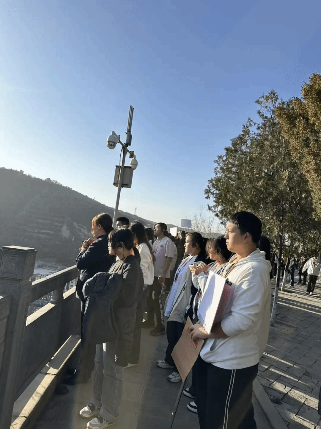 11月15日下午,研学团从延河边出发,沿着起伏的山道和台阶,徒步登上宝塔山。沿途星罗棋布、交相辉映的历史文物和革命文物,吸引大家不时驻足瞻仰。站在宝塔山上俯瞰延安城,那些曾在窑洞里点燃的星火,那些用草鞋丈量过的山河,都化作塔身上斑驳的历史印记。历史是一种穿越时空的精神力量,革命先辈们用热血和生命铸就的延安精神,将永远激励着我们砥砺前行。